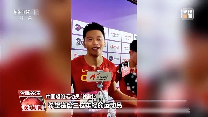 中國短跑運動員 謝震業(yè):是我特意找組委會說,萬一我們拿金牌的話,希望送給三位年輕的運動員,在年輕的戰(zhàn)場上,所有人為他們驕傲鼓掌。