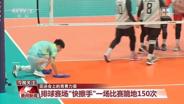 起身疾跑、單膝下蹲、雙手擦拭,整套動作一氣呵成,略帶汗?jié)n的地面馬上恢復光澤。觀看亞運會排球比賽的觀眾對他們可能并不陌生,他們就是在排球比賽過程中負責擦試場地地面的專業(yè)志愿者,大家又親切地稱他們?yōu)椤翱觳潦帧薄?/p>