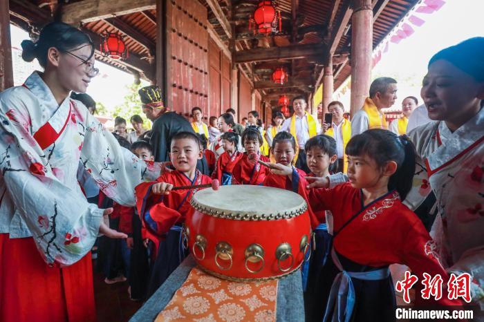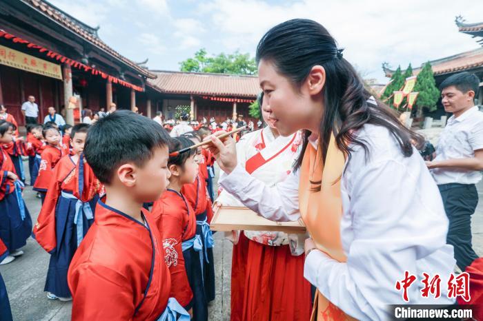 當(dāng)天上午,伴隨《論語》誦讀聲,來自八閩大地的一年級新生及臺(tái)胞學(xué)生列隊(duì)進(jìn)入文廟,依次觸摸象征寓意的吉祥五福。隨后,嘉賓及老師為新生朱砂開智,祈愿從此眼明心亮、志存高遠(yuǎn)。