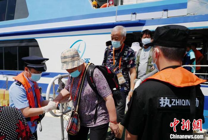 9月22日,福州出入境邊防檢查站民警在靠岸客輪梯口服務臺胞下船上岸。 楊馨 攝