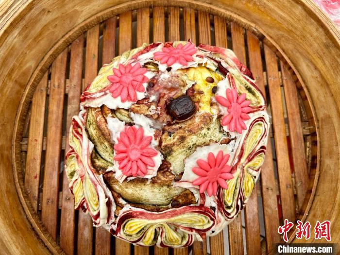 “月餅表面貼的面花需要用不同顏色搭配,面坯整形后擺放進(jìn)蒸籠,再將簡單面花組合為復(fù)雜面花后,依次用清水將各種面花粘在面餅上,最后開始蒸制?!彼尉S梅邊忙活邊說。