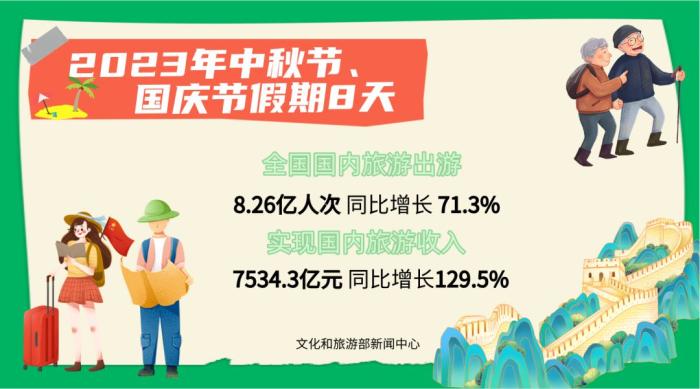 中新網(wǎng)10月6日電 據(jù)文旅之聲微信公眾號(hào)消息,2023年中秋節(jié)、國(guó)慶節(jié)假期,文化和旅游行業(yè)恢復(fù)勢(shì)頭強(qiáng)勁,全國(guó)假日市場(chǎng)平穩(wěn)有序。經(jīng)文化和旅游部數(shù)據(jù)中心測(cè)算,中秋節(jié)、國(guó)慶節(jié)假期8天,國(guó)內(nèi)旅游出游人數(shù)8.26億人次,按可比口徑同比增長(zhǎng)71.3%,按可比口徑較2019年增長(zhǎng)4.1%;實(shí)現(xiàn)國(guó)內(nèi)旅游收入7534.3億元,按可比口徑同比增長(zhǎng)129.5%,按可比口徑較2019年增長(zhǎng)1.5%。