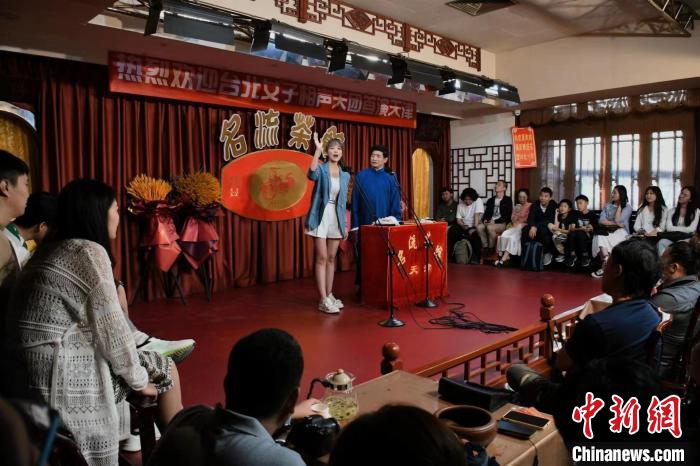 9月30日,姬天語與師傅劉增鍇在天津名流茶館為觀眾帶來精彩的相聲表演。中新社記者 佟郁 攝