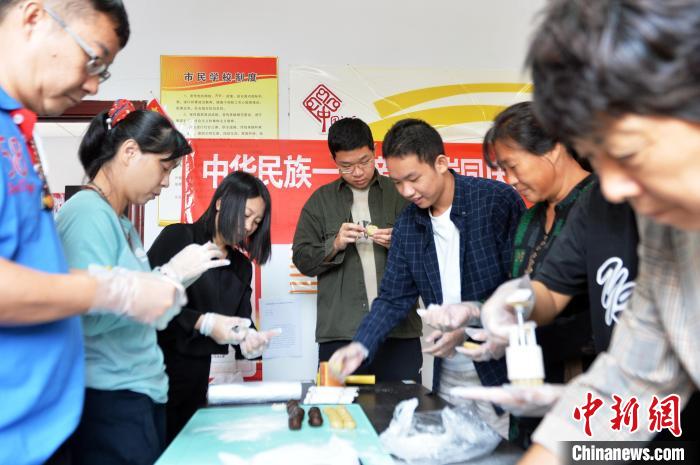 9月26日,賴秋萍和鄰居們將寶島的豆沙餡、大陸的月餅皮裹成玲瓏的小月餅,香香糯糯?!∨碓戮?攝