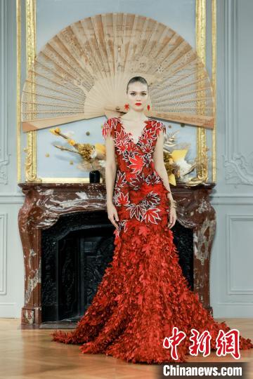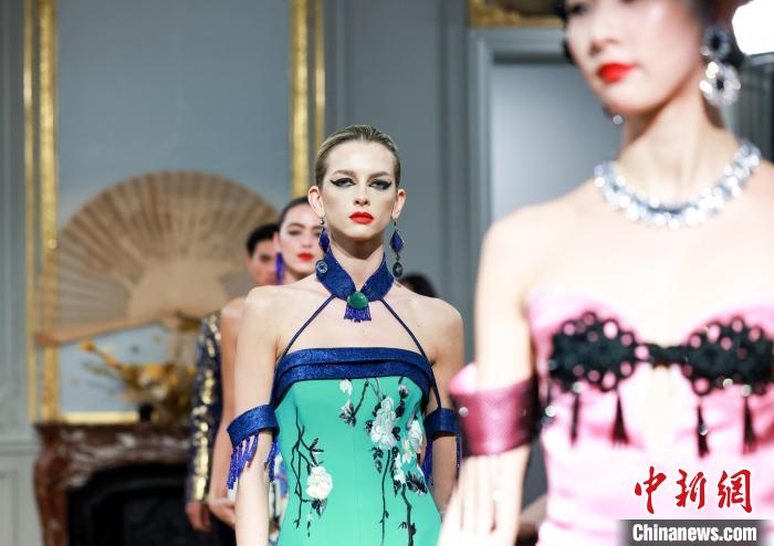 巴黎中國文化中心主體建筑是19世紀(jì)的孟德斯鳩公館。當(dāng)晚,“恭王府服飾秀”作為巴黎中國文化中心2023中法時裝周開幕大秀,展出國際著名服裝設(shè)計師勞倫斯·許創(chuàng)作的恭王府系列高定服裝,提取恭王府古建園林、建筑彩畫、天下第一福等傳統(tǒng)文化元素,將精致的云錦面料與苗繡、蘇繡等技法相結(jié)合,采用西方立體裁剪,在穿針引線中展現(xiàn)巧奪天工的傳統(tǒng)技藝,讓世界看見中國傳統(tǒng)“精雅生活”。
