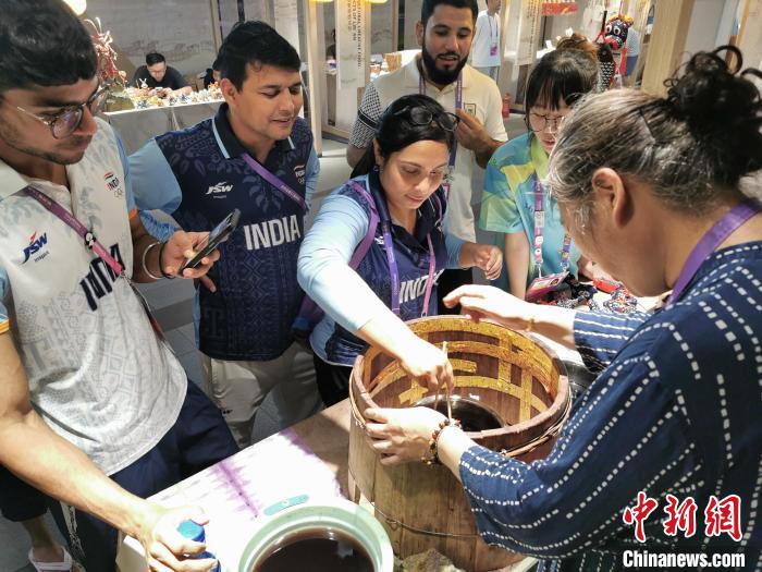 9月29日,國(guó)際友人在亞運(yùn)村體驗(yàn)非物質(zhì)文化遺產(chǎn)過(guò)江布制作。夏衍 攝