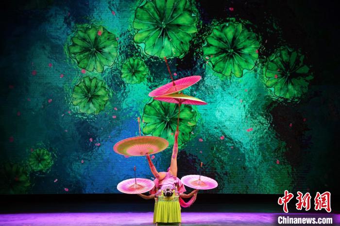 中國(guó)雜技團(tuán)新晉優(yōu)秀青年演員扛鼎經(jīng)典作品中秋專(zhuān)場(chǎng)演出《青春ing》現(xiàn)場(chǎng),圖為經(jīng)典節(jié)目《荷韻——單人蹬傘》。中國(guó)雜技團(tuán)供圖