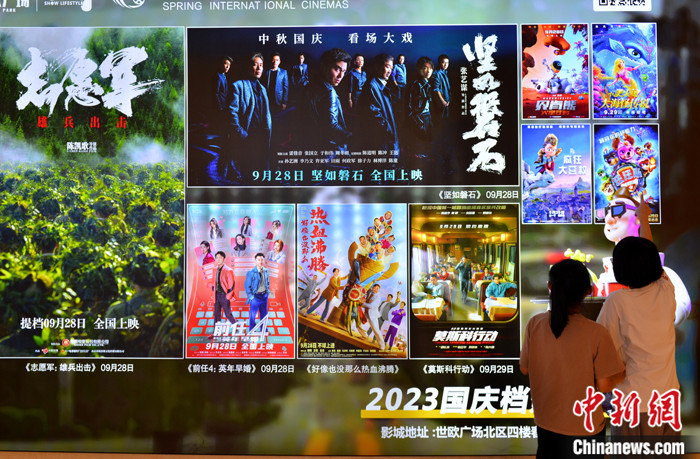 圖為10月3日,福建福州,市民在電影院內(nèi)瀏覽影片海報(bào)。 中新社記者 呂明 攝