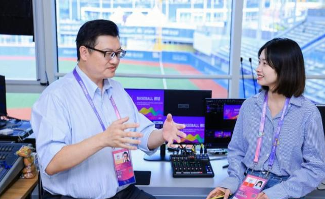 亞運棒球項目體展導(dǎo)演(左)接受記者專訪。穆道亮 攝