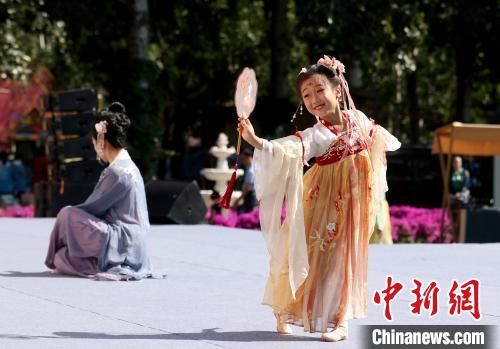 9月30日國慶節(jié)前夕,小朋友著漢服在北京世界花卉大觀園舞蹈,樂享假期。中新社記者 張宇 攝