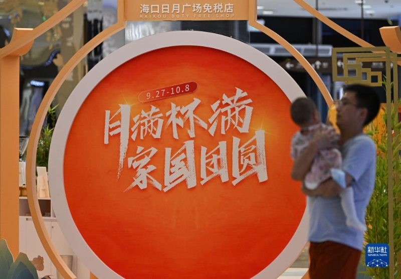 9月29日在中免集團??谌赵聫V場免稅店拍攝的促銷海報。