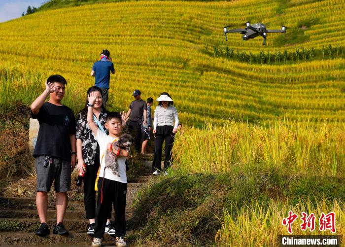 10月2日,游客在龍脊鎮(zhèn)平安壯寨梯田間用無人機拍視頻留念。楊宗盛攝