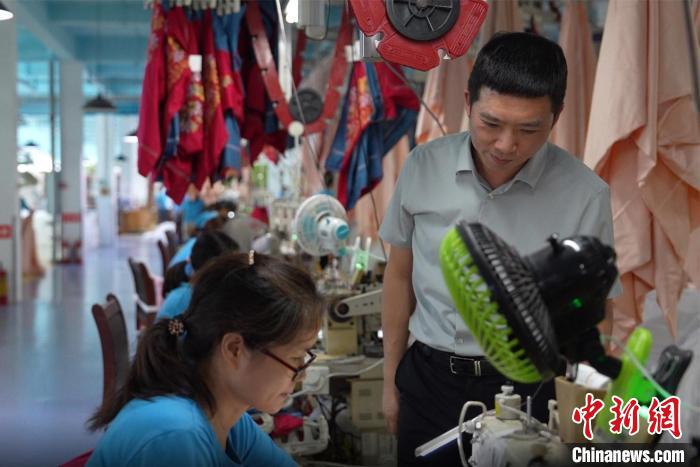 8月28日,“臺二代”、湖南富麗真金家紡有限公司總經(jīng)理杜俊毅(右)在車間與員工交流?!钍篮?攝