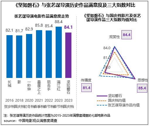 張藝謀導(dǎo)演新作《堅(jiān)如磐石》獲得觀眾滿意度評(píng)分84.1分,居2023年國(guó)慶檔調(diào)查五部影片首位,也是檔期內(nèi)唯一一部滿意度超84分的影片,保持了張藝謀導(dǎo)演系列電影作品的高滿意度水平。