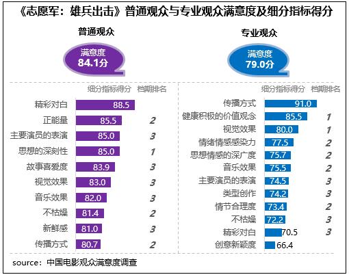 在不同觀眾評(píng)價(jià)上,《志愿軍:雄兵出擊》相對(duì)更受專業(yè)觀眾青睞,專業(yè)觀眾滿意度得分79.0分,居檔期第二位;在細(xì)分指標(biāo)中,健康積極的價(jià)值觀念、視覺效果兩項(xiàng)指標(biāo)得分居檔期首位,同時(shí)分別居2023年調(diào)查50部影片的第4位和第8位。影片普通觀眾滿意度得分84.1分,居檔期第三位,僅比《堅(jiān)如磐石》和《93國(guó)際列車大劫案:莫斯科行動(dòng)》分別低0.1分、0.02分,細(xì)分指標(biāo)中思想深刻性得分居檔期首位。
