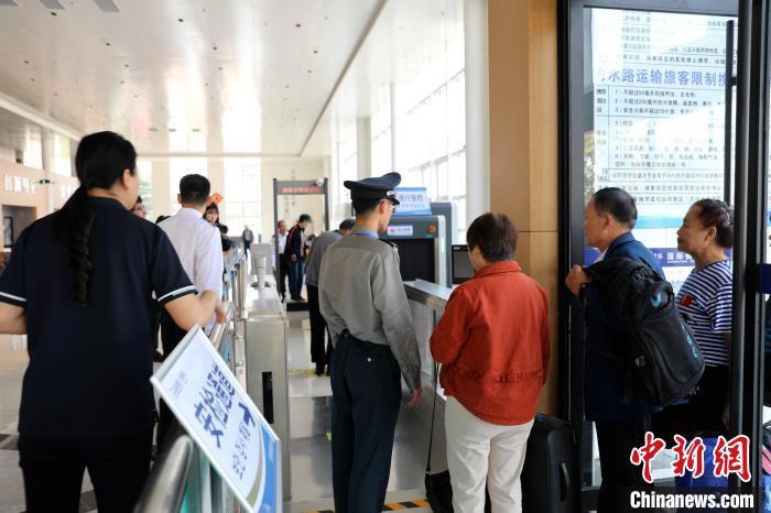 圖為“日照東方”輪旅客排隊安檢進候船廳。 婁華軒 攝