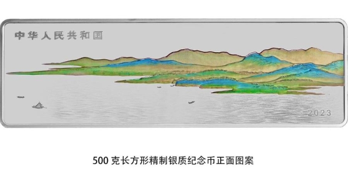 500克長方形銀質(zhì)紀念幣正面圖案為山、水等組合設(shè)計,并刊國名、年號?! ?/p>