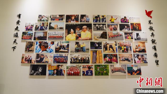 在秦榮華家中的墻上,掛著他過去30多年來在大陸各地走訪、參與公益、推動(dòng)兩岸交流的照片?!≈行律缬浾?楊程晨 攝