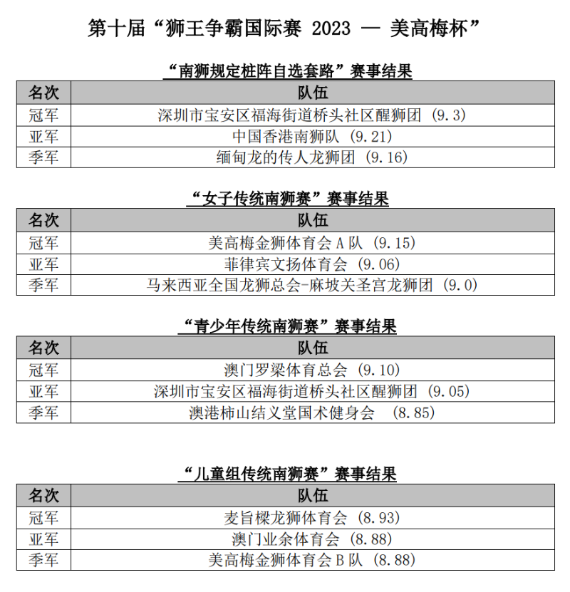 而在10月7日舉行的“女子傳統(tǒng)南獅賽”中,各位女獅運(yùn)動(dòng)員盡顯巾幗風(fēng)采,由美高梅金獅體育會(huì)A隊(duì)以9.15分奪得女獅王殊榮,而亞軍及季軍分別由菲律賓文揚(yáng)體育會(huì)及馬來西亞全國龍獅總會(huì)-麻坡關(guān)圣宮龍獅團(tuán)奪得。