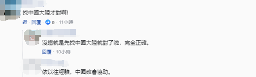 還有網(wǎng)友稱,“找中國大陸才對啊!”“沒錯就是先找中國大陸不對了,完全正確?!薄鞍匆酝?jīng)驗(yàn),大陸會協(xié)助。” ↓