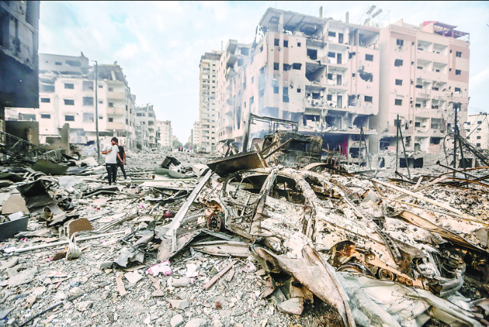 10月10日,在加沙城,人們走過(guò)被以色列空襲炸毀的建筑廢墟。(視覺(jué)中國(guó))