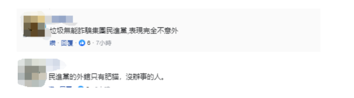 “垃圾無(wú)能詐騙集團(tuán)民進(jìn)黨,表現(xiàn)完全不意外。”“民進(jìn)黨的外館只有肥貓,沒(méi)辦事的人。” ↓