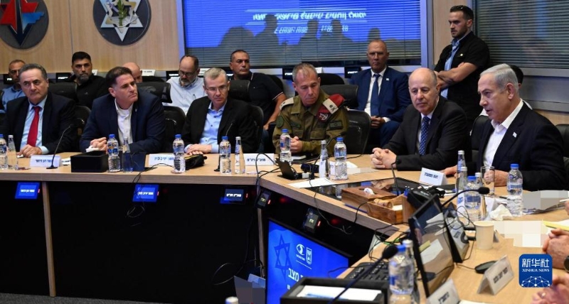 10月7日,以色列總理內(nèi)塔尼亞胡(前排右五)出席在特拉維夫舉行的安全內(nèi)閣會(huì)議。