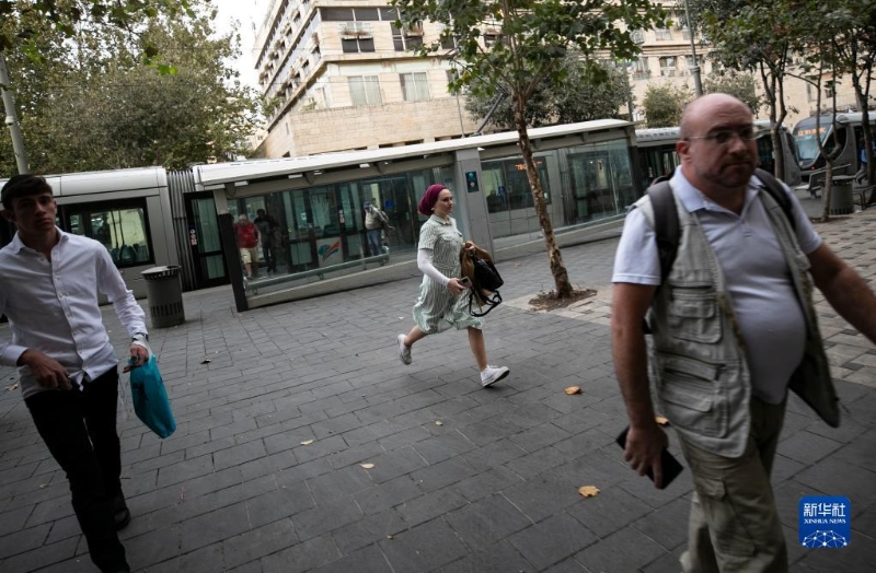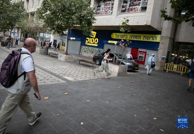 10月9日,在耶路撒冷街頭,人們?cè)诜揽站瘓?bào)響起時(shí)沖向避難設(shè)施。