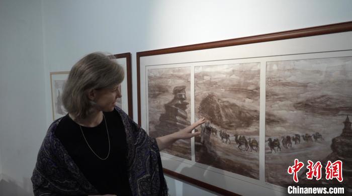 圖為冉妮婭介紹自己第一幅有關(guān)絲綢之路的作品《在路上》。田鵬鶴 攝