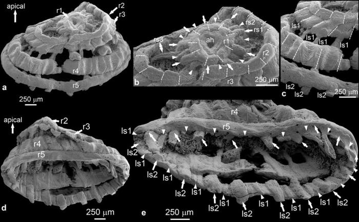 記者了解到,本次研究一共報(bào)道了3枚標(biāo)本,均為毫米級別。其中1枚保存較好的化石呈現(xiàn)“五環(huán)”狀結(jié)構(gòu),從頂?shù)降子?個直徑逐漸增大的環(huán)組成。