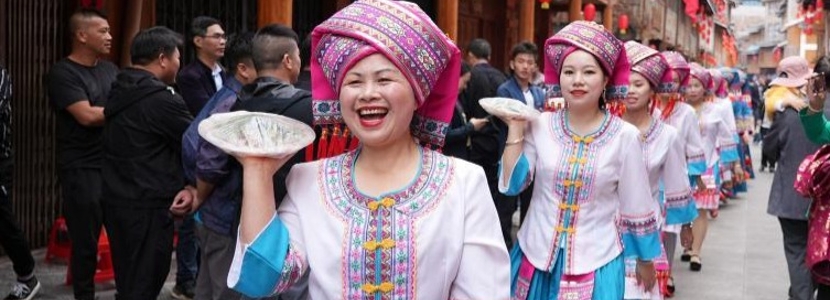 10月10日,廣西桂林市龍勝各族自治縣瓢里鎮(zhèn)舉辦“魚宴節(jié)”。當(dāng)?shù)貕炎迦罕婇_展原始捕魚手藝表演、萬尾魚苗放流、渾水摸魚、魚生制作技藝競技、傳統(tǒng)“百家宴”等活動歡慶豐收?;顒游吮姸嘤慰颓皝韰⑴c體驗(yàn)。圖為在龍勝各族自治縣瓢里鎮(zhèn),傳統(tǒng)上菜模式成為一道靚麗風(fēng)景線。韋吉陽 攝