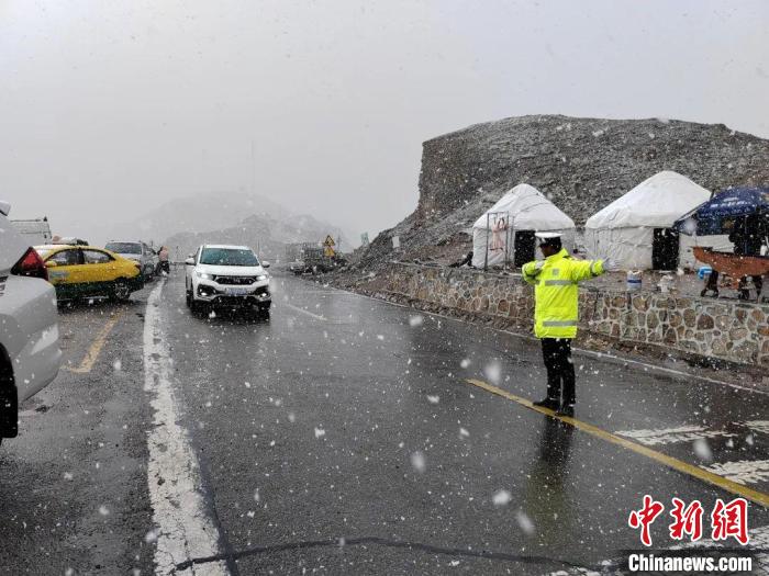 新疆察布查爾縣交警在伊昭公路上指揮機(jī)動車通行。(新疆公安廳交通警察總隊提供)