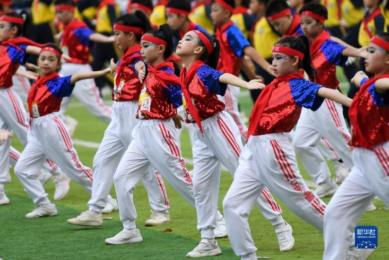 10月11日,參加活動的少先隊員表演第三套全國小學生廣播體操《七彩陽光》。