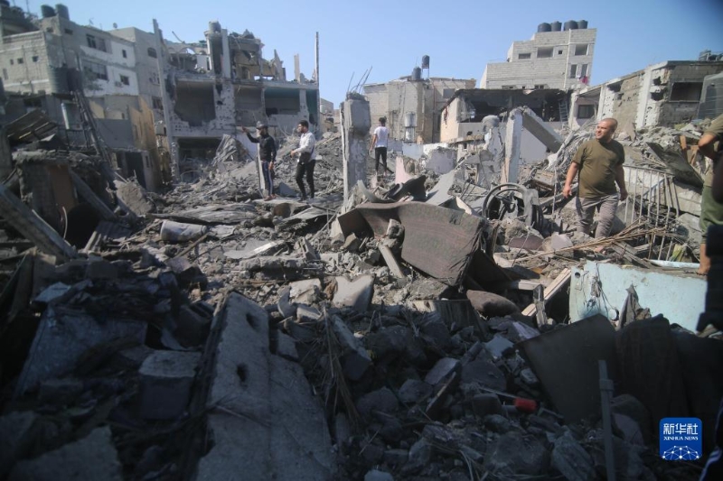 10月11日,在加沙地帶南部城市拉法,人們查看以色列空襲炸毀的建筑。