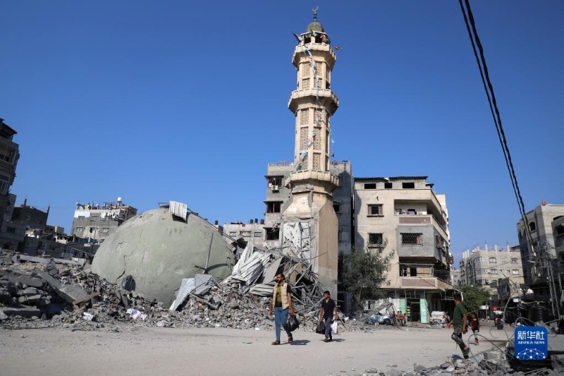 10月11日,在加沙城,人們走過(guò)以色列空襲炸毀的建筑廢墟。