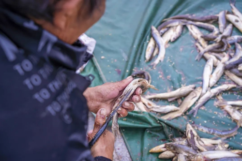 為了追尋神魚的腳步,我們一行沿著湖邊轉(zhuǎn)了很長時間,終于在距離湖不遠的一處水溝發(fā)現(xiàn)了神魚的蹤跡,除了岸邊已經(jīng)死亡的,水中還有大量的正在“逆流而上”的活魚。水岸上方是來回盤旋的紅嘴鷗,旁邊的地面上有農(nóng)牧民搭建的晾曬小魚干的臨時房屋。在這里,神魚干已經(jīng)成為一種特色的商品,每條要40-50元。