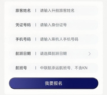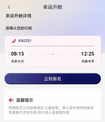 旅客可通過中國聯(lián)合航空APP、移動官網(wǎng)m.flycua.com、微信小程序,點擊活動鏈接辦理。報名開始時間與截止時間為航班計劃起飛前48小時內(nèi)至航班計劃起飛前4小時。值得注意的是,旅客需完成會員注冊及實名認證后,處于未值機狀態(tài)下方可參與報名。中國聯(lián)合航空將自動為幸運旅客辦理升艙/值機并發(fā)送短信通知。幸運旅客為隨機選取,如未被選中還請關(guān)注航班值機情況,及時辦理值機。目前該活動暫不支持U艙客票旅客及兒童旅客、嬰兒及申請?zhí)厥夥章每汀?/p>