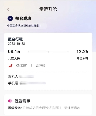 報名規(guī)則顯示,此次上線的“幸運升艙”服務針對購買中國聯(lián)合航空經(jīng)濟艙北京始發(fā)且中國聯(lián)合航空實際承運航班的旅客。中國聯(lián)合航空將于計劃起飛前4小時從活動報名旅客中隨機抽取幸運旅客,免費升級至超級經(jīng)濟艙。
