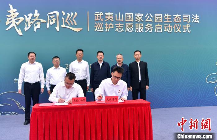 主辦方為推進(jìn)“院校合作”司法研學(xué)有機銜接,將武夷山國家公園司法巡護(hù)與常態(tài)化高校志愿服務(wù)結(jié)合,從志愿實踐、學(xué)術(shù)研究、協(xié)同保護(hù)等方面入手,將司法巡護(hù)的足跡踏遍綠水青山,儀式現(xiàn)場,武夷山法院與武夷學(xué)院簽訂《武夷山國家公園生態(tài)司法志愿巡護(hù)項目共建協(xié)議書》。