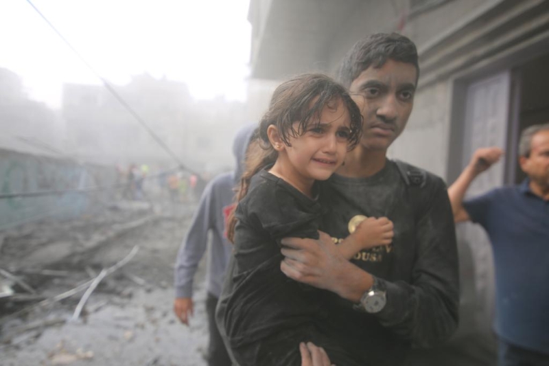 10月12日,在加沙地帶南部城市拉法,一名男子抱著小女孩走在遭以色列空襲的受損建筑中。新華社發(fā)(哈立德·奧馬爾攝)