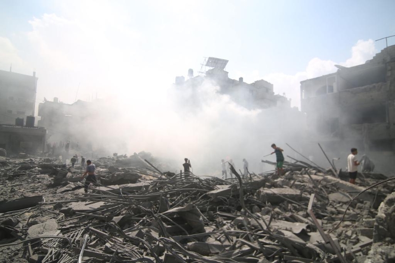 10月12日,在加沙地帶南部城市拉法,人們在遭以色列空襲的受損建筑中救援傷者。新華社發(fā)(哈立德·奧馬爾攝)