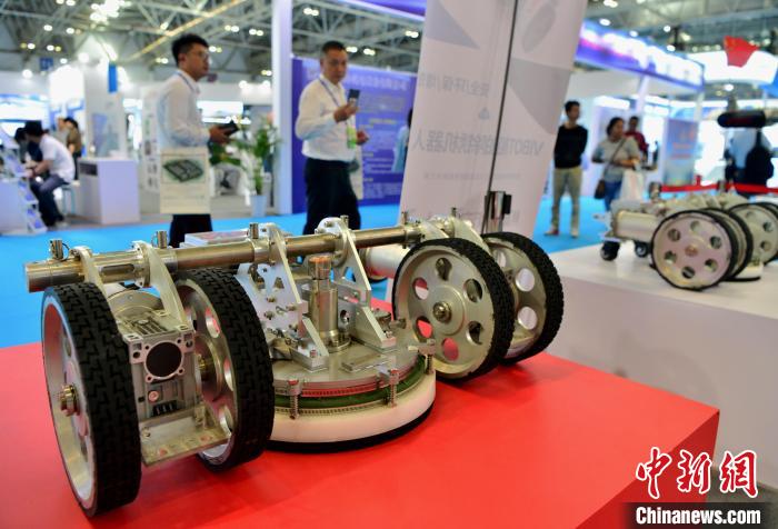 圖為10月13日,博覽會上展示的船舶除銹機器人。 張斌 攝