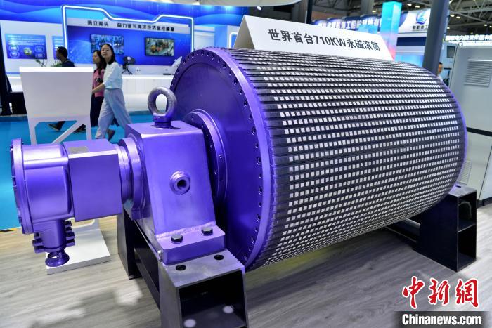 圖為10月13日,博覽會上展示的可應用于港口物料運輸?shù)氖澜缡着_710KW永磁滾筒。 張斌 攝
