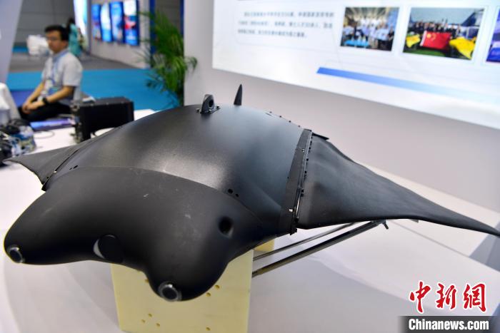 圖為10月13日,博覽會上展示的滑撲一體仿蝠鲼柔體潛水器。 張斌 攝