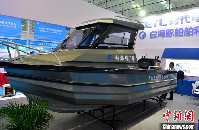 圖為10月13日,博覽會上展示的新能源電動艇。 張斌 攝