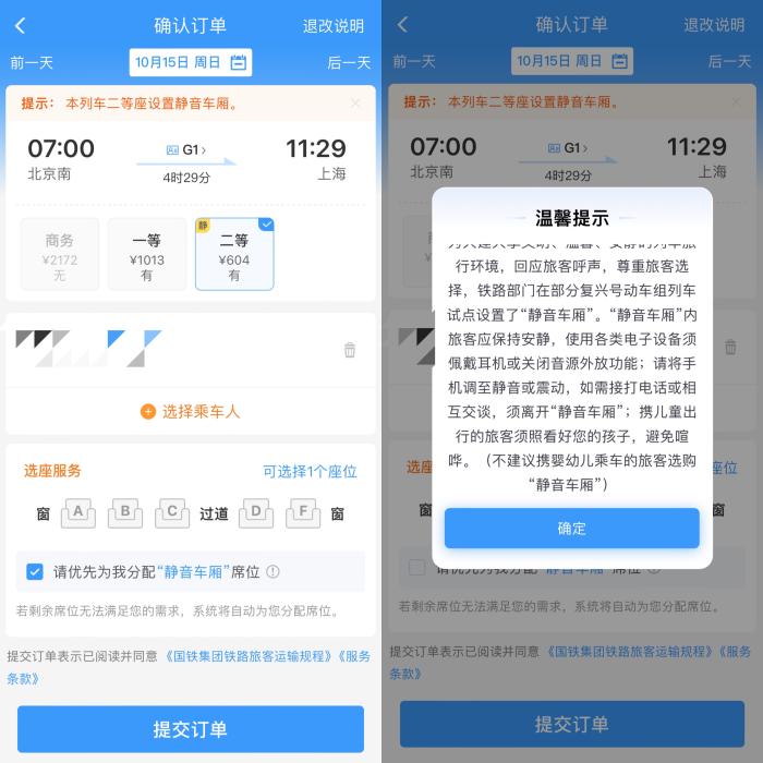 鐵路12306APP購票頁面上的“靜音車廂”提示