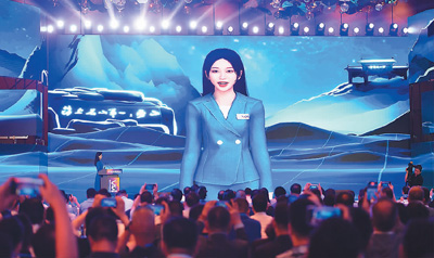 在山東省青島市嶗山區(qū)舉辦的2023國際虛擬現(xiàn)實創(chuàng)新大會開幕式上,現(xiàn)實和虛擬主持人的雙向互動成為會場亮點。王海濱攝(人民圖片)