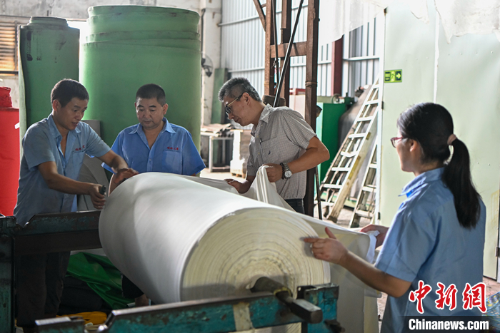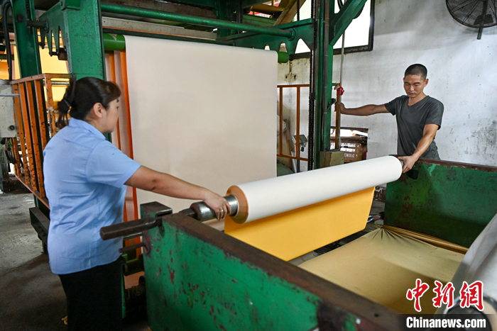 圖為9月11日,廣東省惠州市,皮革廠工作人員在檢查皮革材料。 中新社記者 陳驥旻 攝