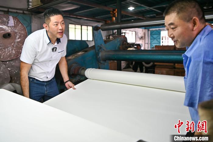 9月11日,臺灣青年黃建智在生產線上與工作人員一起檢查皮料?!≈行律缬浾?陳驥旻 攝