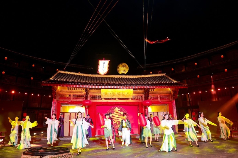 現(xiàn)場(chǎng)還上演了以“天涯共此樓”為主題的開場(chǎng)舞,通過將三天兩夜的沉浸式演繹濃縮至一小時(shí),借身著華服的舞者與特殊的聲光電效果演繹天刀世界的俠骨柔情。期間,一只翼展達(dá)4米的“鳳凰”將從土樓上空方盤旋而至,為游客帶來鳳凰唯美的飛天表演,取意“鳳凰來儀,遇見土樓”, 以示祝福和祈愿。